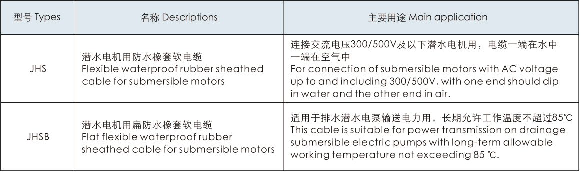 適用范圍本產品適用于交流額定電壓300/500V及以下潛水電機設備用防水橡套軟電纜。本產品執行標準為:Q/321084KLA102。使用特性1、額定電壓Uo/U為300/500V及以下;2、電纜導體長期允許工作溫度為  a)JH型為65℃  b)JHSB型為85℃